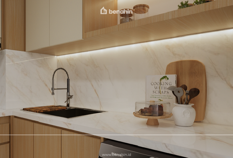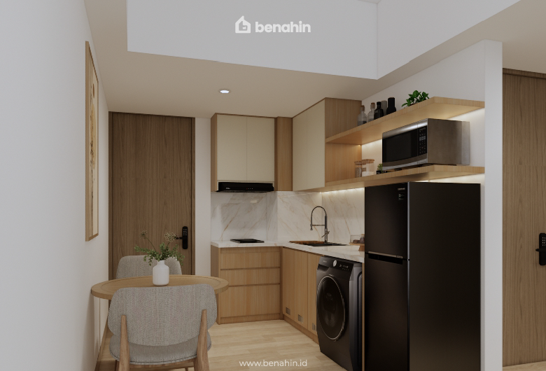 Design interior and build F+F Apartemen, area kitchen sebagai tempat penyimpanan yang paling penting, sehingga pada F+F apartment terdapat kabinet atas tertutup untuk menyimpan peralatan dapur, rak terbuka untuk penyimpanan bumbu dapur dan microwave, serta kabinet bawah dibuat tertutup agar tidak terkena air. Backsplash dan table top motif marble warna putih dipilih untuk mendampingi motif kayu yang dominan pada ruangan. Bagian ujung kabinet bawah disesuaikan sebagai kabinet mesin cuci. Hal ini dilakukan untuk memaksimalkan penggunaan ruang apartemen yang pada umumnya.